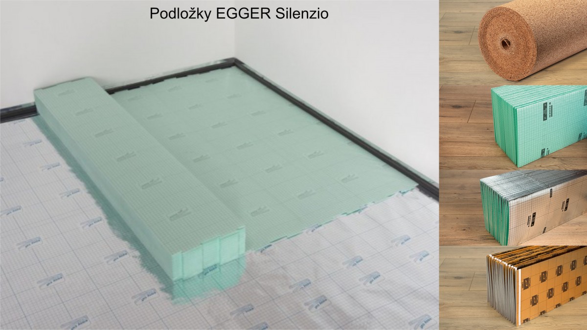 Základom správne položenej laminátovej podlahy je výber správnej podložky, ktorá poskytuje tepelnú a zvukovú izoláciu, čím zvyšuje užívateľský komfort. Dokáže spoľahlivo tlmiť zvuk, ktorý vzniká pri chôdzi. Zároveň predĺžuje životnosť (trvanlivosť) podlahy. Je potrebné dokúpiť ju samostatne. Na trhu nájdeme rôzne typy podložiek, ktoré sú vhodné pod plávajúce laminátové podlahy napr. podložky z HFPS peny ( vysokoflexibilný polystyrén), XPS podložky (extrudovaný polystyrén), ale aj prírodné alternatívy napr. korkové podložky (EGGER Silenzio Cork). Aby boli naplnené garančné podmienky, vždy používajte systémové podložky, ktoré doporučuje výrobca danej značky podlahy! Pre laminátové podlahy EGGER sú odporúčané podložky EGGER Silenzio. Vyvarujte sa použitiu hrubých podložiek, nakoľko nekvalitná hrubá podložka môže viesť pri zaťažení podlahy k zlomeniu klikového zámku, vŕzganiu podlahy a pod. Je dôležité nezabudnúť pri pokládke podlahy aj na použitie parozábrany, ktorá sa umiestňuje pod samotnú podložku. Túto parozábranu je nevyhnutné použiť vtedy, ak kladiete podlahu na minerálny podklad ( betón, poter a pod. ). Spoľahlivo zabráni prestupu vlhkosti z podkladu, aby nedošlo k poškodeniu vašej podlahy. Niektoré podložky už majú túto paraozábranu integrovanú ( napr. podložka EGGER Silenzio SD a EGGER Silenzio DUO).