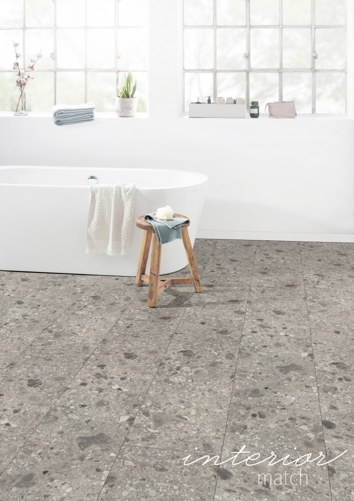 Vodoodolná podlaha z rady Laminát Aqua+ vás zaujme svojou kvalitou, univerzálnosťou a štýlom. Vďaka vodoodolnej nosnej doske Aqua+ podlaha odoláva vode až 72 hodín! Triestino Terrazzo sivé napodobňuje vzhľad dlažby z prírodného kameňa. Vďaka podlahovým doskám vo formáte Kingsize môže tento dekor naplno rozvinúť svoj krásny vzhľad. 4- stranné priznané drážky po celom obvode zvýrazňujú vzhľad jednotlivých podlahových dosiek, pričom aj stredom lamely je vedená reálna priznaná drážka, ktorá dodáva podlahe vzhľad dlažby. Tento dekor je súčasťou konceptu Interior match. Je dekorovo zhodný s nábytkovým dekorom F021 ST75 z Kolekcie dekoratívnych materiálov EGGER.